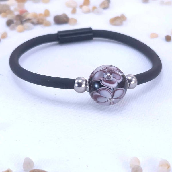 Armband van rubber met een glaskraal, een zwarte magneet-sluiting van edelstaal en kleine kralen van edelstaal.