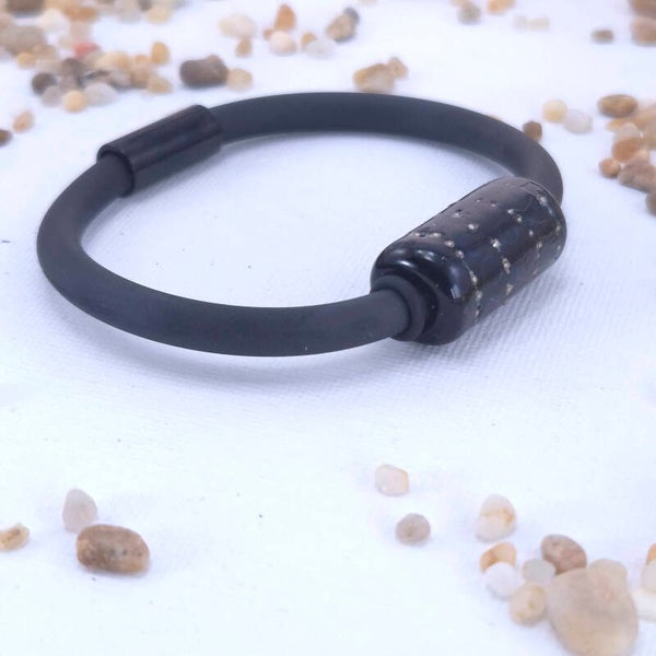 Armband van rubber met een glaskraal en een zwarte magneet-sluiting van edelstaal.