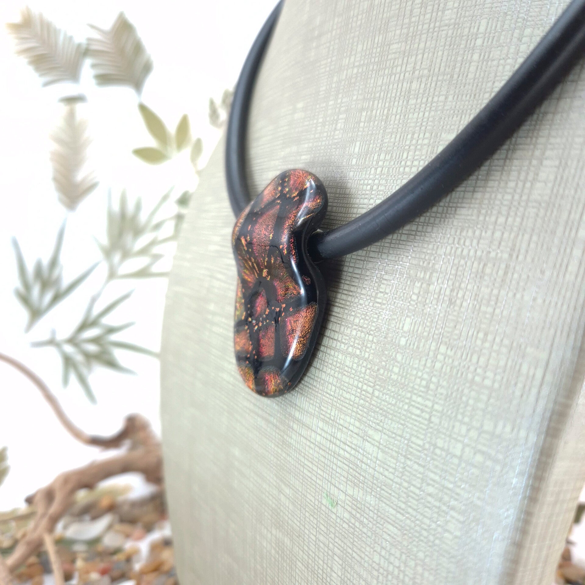 Een robuuste ketting met grote hanger van zwart met oranje/bruin dichroic glas.