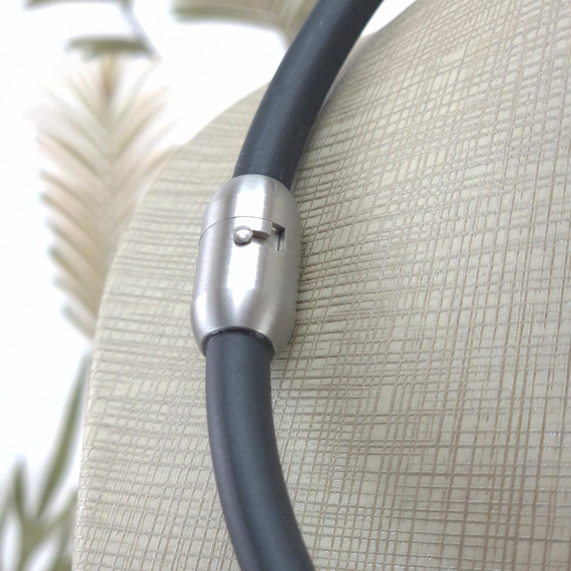 De glashanger hangt aan een rubber collier van 6 mm en heeft een magneetsluiting van edelstaal met bajonet beveiliging.