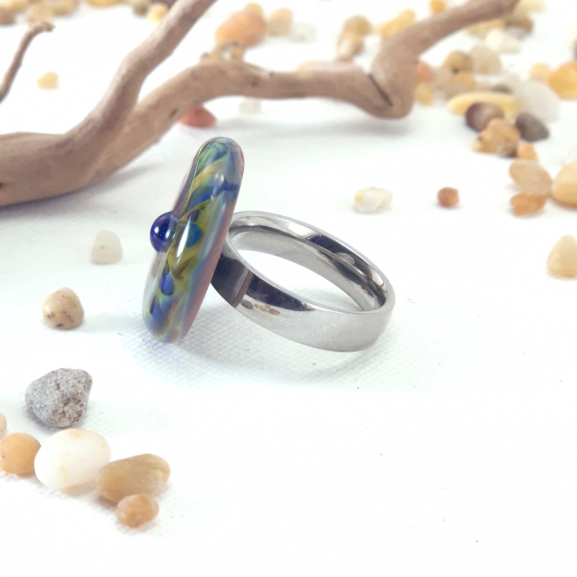 Glastop L van donkerblauw glas met geelgroen/blauw/roze en reliëf