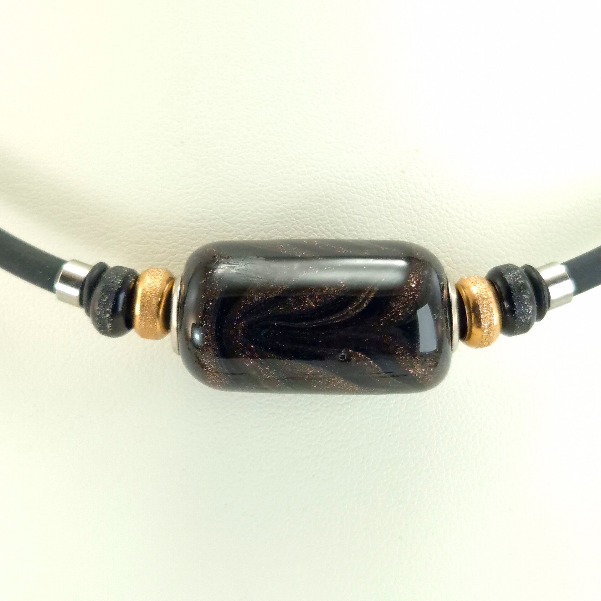 Een eigentijds glassieraad met een mooie glaskraal aan een spang van zwart rubber (4 mm) met memory-wire en kralen van edelstaal
