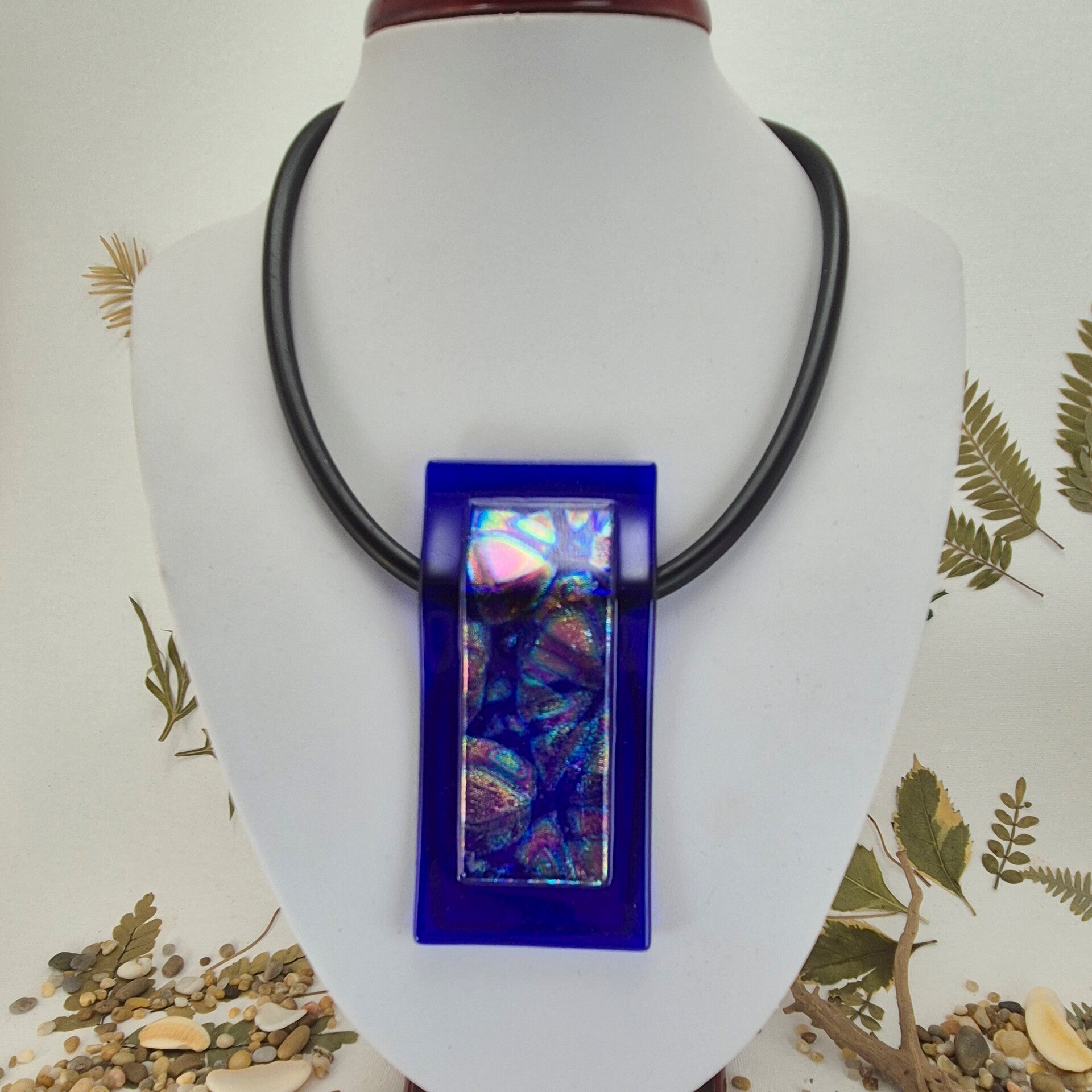 Halsketting met grote hanger van blauw met multi-color dichroic glas