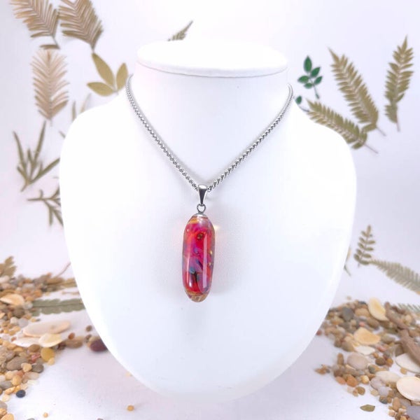 Langwerpig ronde glashanger van roze glas met iets zwart en lichtblauwe waas.