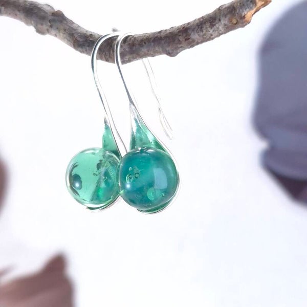 Verzilverde oorbellen met zachtgroene glasbolletjes