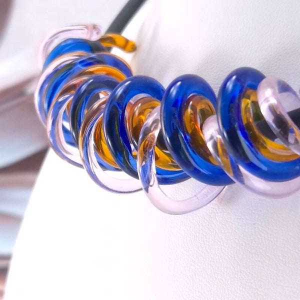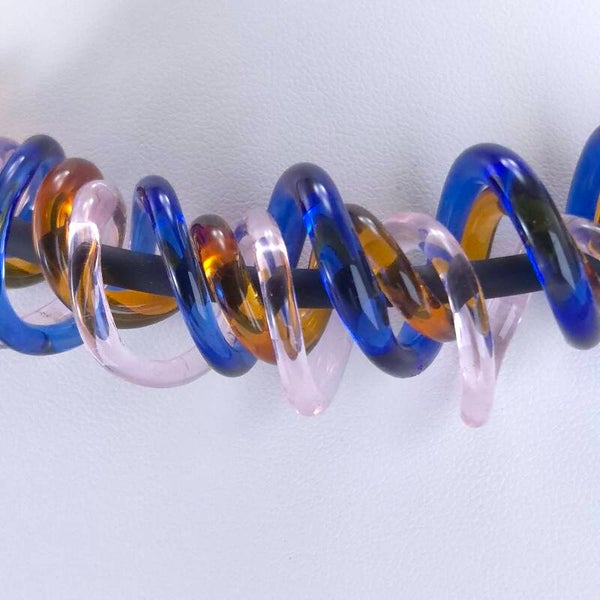 Een bijzondere ketting met 3 losse spiralen van borosilicaat glas.
