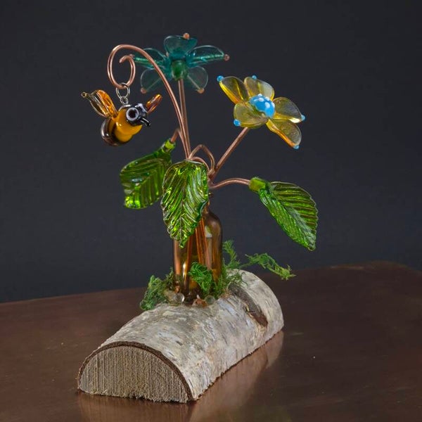 Twee bloemen en blaadjes van glas en een bungelend bijtje in een bruin flesje op hout.De stengels zijn van koper.