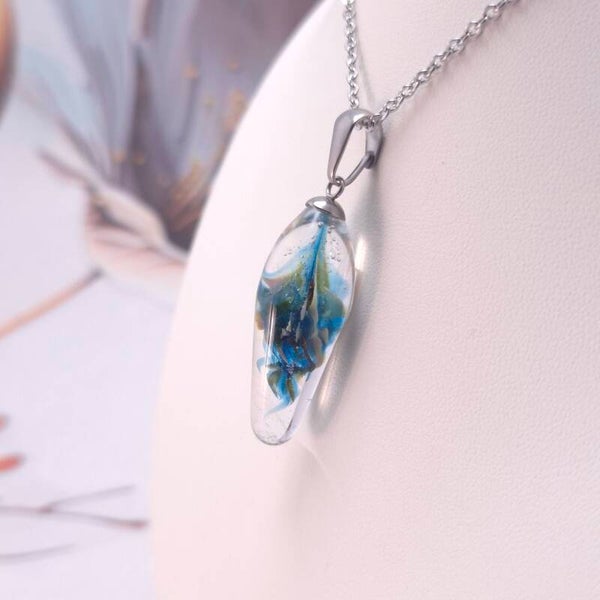 Fijn glashangertje van transparant glas met turquoise-wit-bruine implosie.